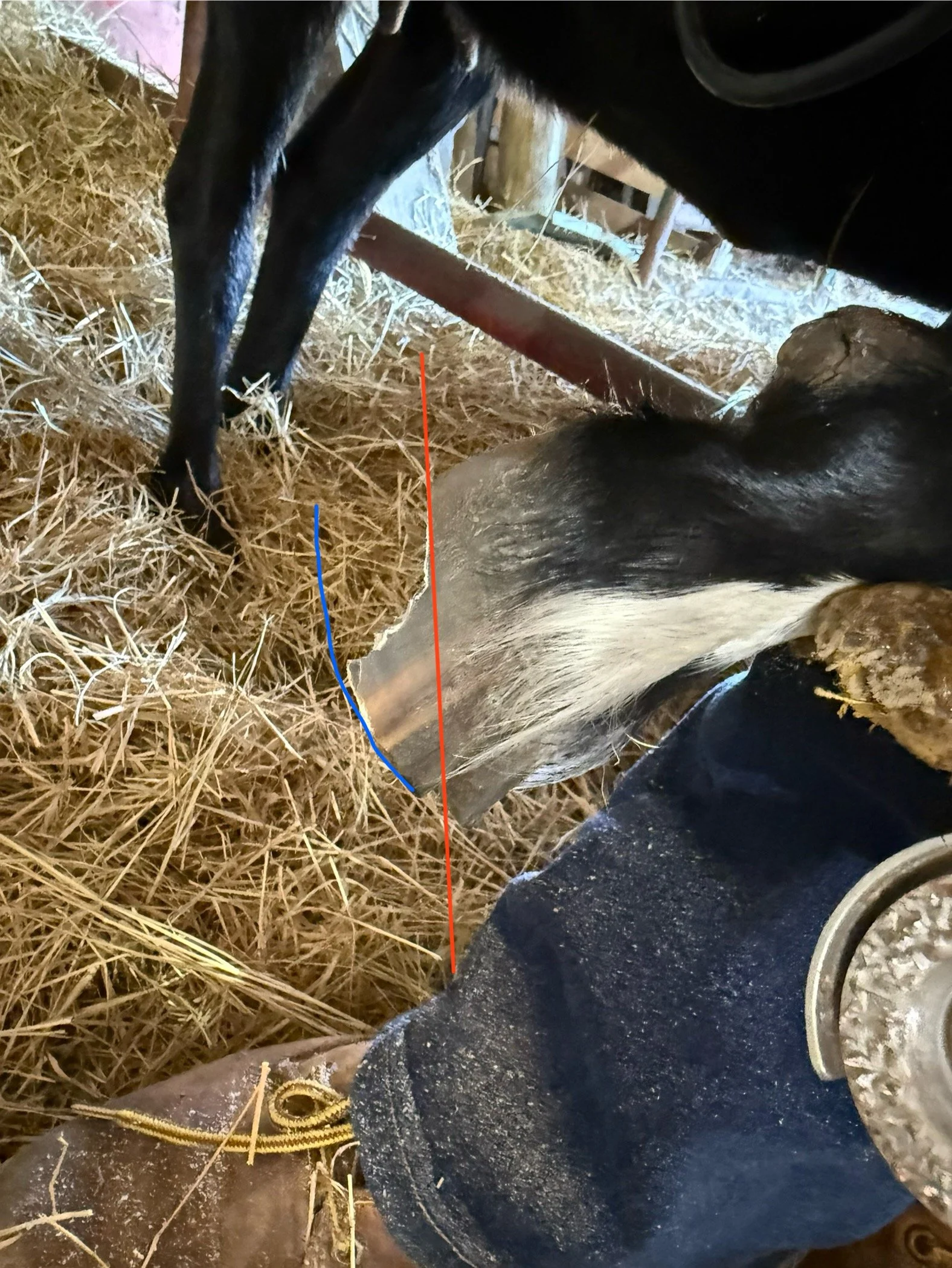 Red line is where the sole should be, and how far back this goat was trimmed. Blue line is where the hoof was. Approximately 3/4” taken off sole to correct this goats feet.